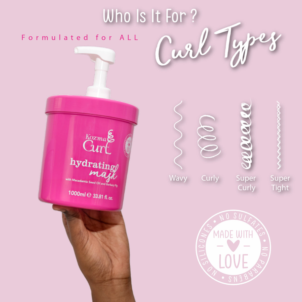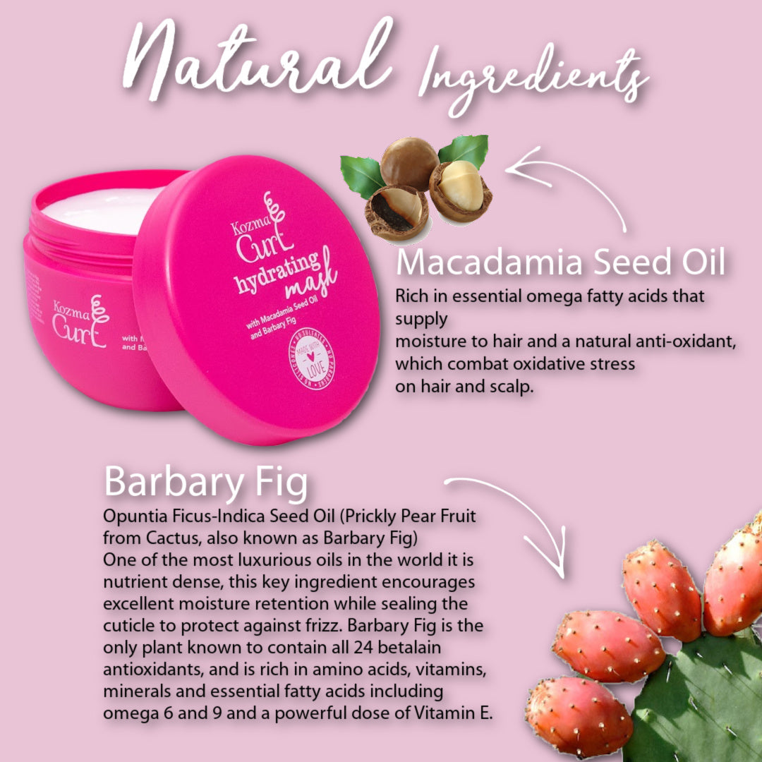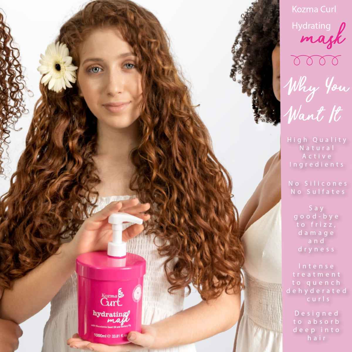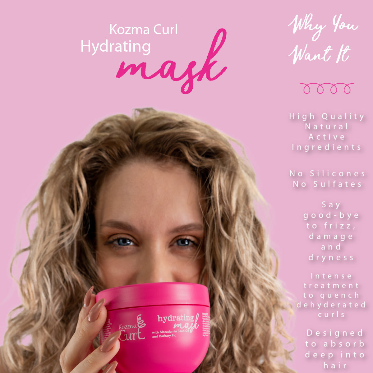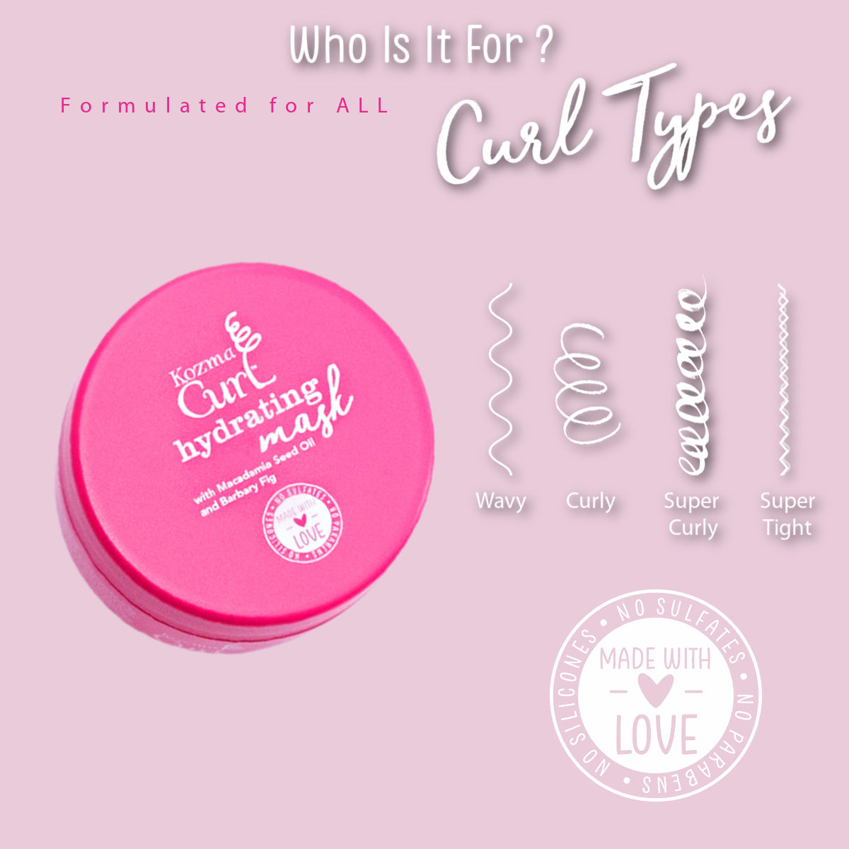 About Kozma Curl Hydrating Mask: Kozma Curl Hydrating Mask 300ml comes with in a convenient jar to help you easily dip with your hands while working with your curls in the shower! Also available in a 1 liter size with pump. Melt this lush mask into your hair and say goodbye to frizz, damage and dryness. This is a treat your hair will love! This intense treatment is designed to absorb deep into the hair and quench the thirst of even the most dehydrated curls. Promotes healthy curl elasticity. Results are soft, manageable, and happy curls. This treatment will help your curls to look and feel healthy, happy and gorgeous!